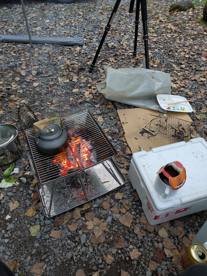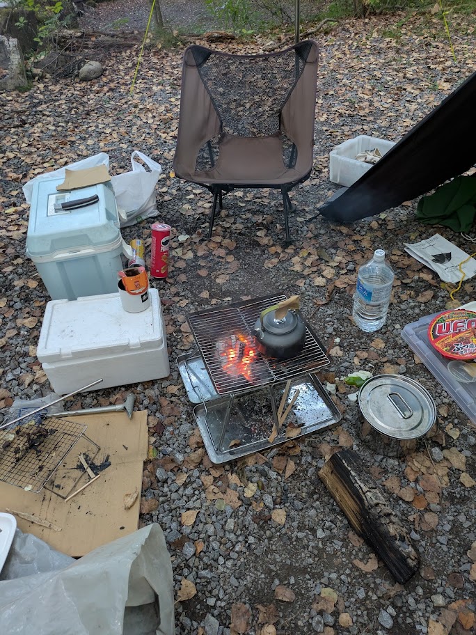 朝珈琲を飲みため火を起こして湯を沸かすまで1時間かかるし、撤収のさい残った火を始末するのも面倒だった。