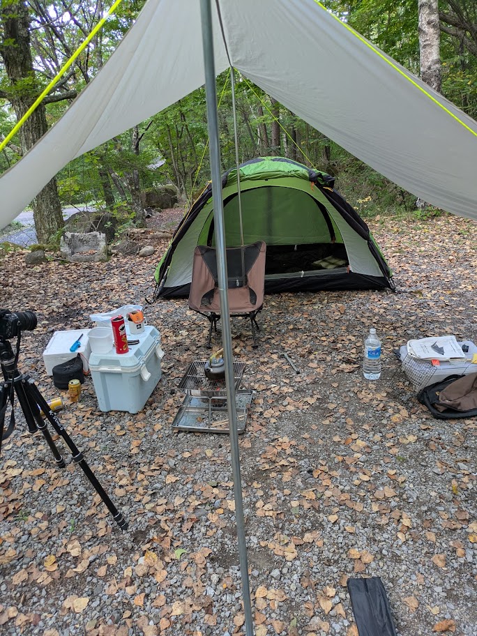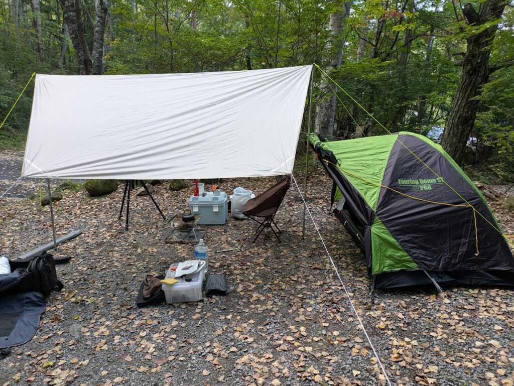 タープは一番高い所でも身長くらいしかない、ロープも4本張ってあってひっかかりやすいので動線を考えた配置が大事だ。