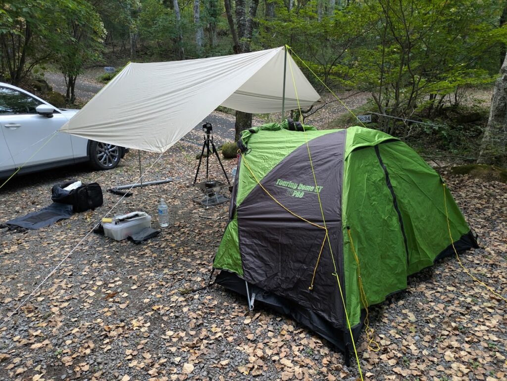 ドーム型テントを組み立てるのは簡単なのだが、一人でポールを2本立ててタープを張るという作業は要領が悪いとうまくできない。