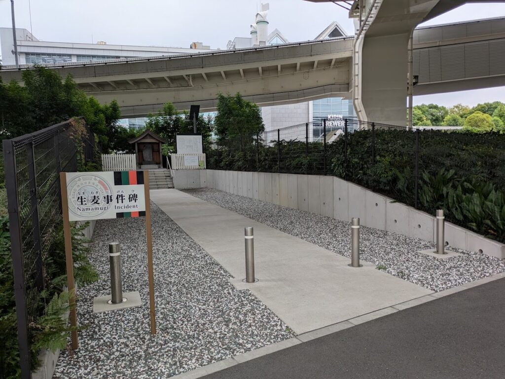 そして工場のすぐ前に生麦事件の記念碑が建っていた(後ろがビール工場)。