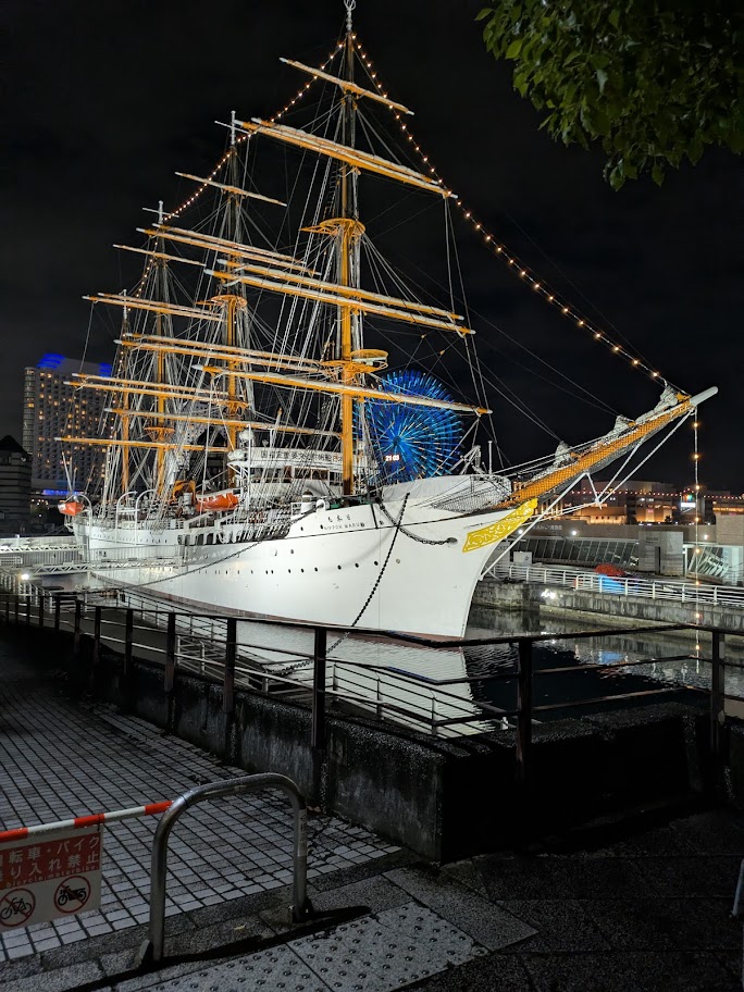 夜も更けて、帰り道で見た帆船がライトアップされてキレイ・・・