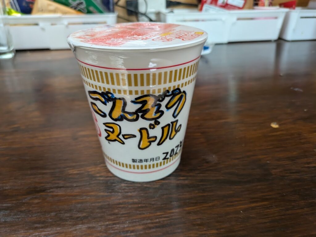 空のカップにマジックで好きなように書いてからスタッフに麺と粉末スープと具を4種類入れてもらってシュリンク包装して完成。